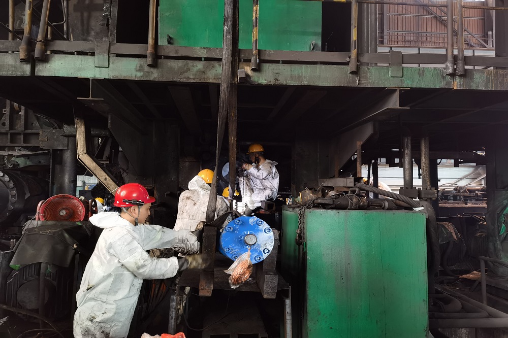 轧线是生产车间的高温区域,在室外高温叠加的情况下,更如烤炉一般。每次带着客户参观,一趟下来都会大汗淋漓。时常能看到一群人,厂服外又套上一层白色防护服,蹲在轧线旁边作业,他们是青拓辉煌的基石。