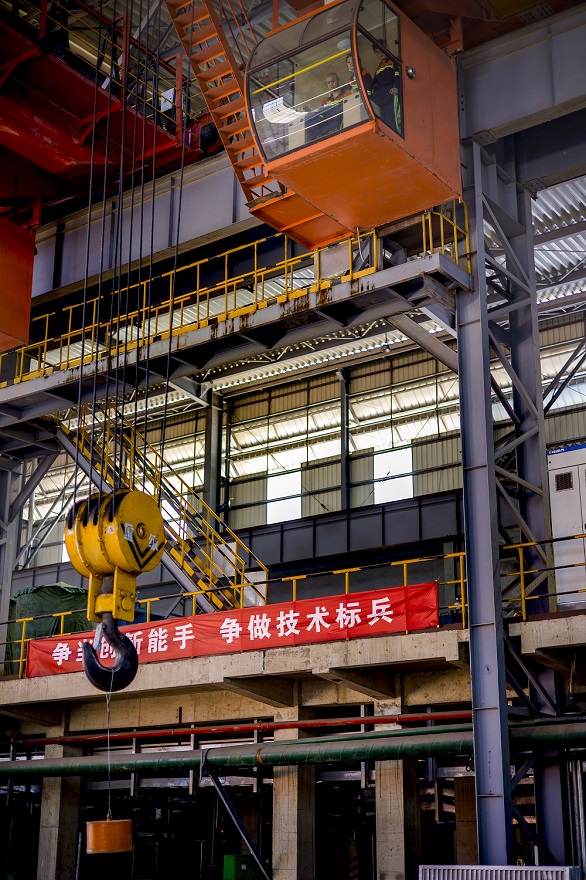 在青拓特钢车间,行车比赛现场行车女工们巾帼不让须眉,吊物、过杆等一系列操作一气呵成,精湛的操作技术赢得现场阵阵掌声。